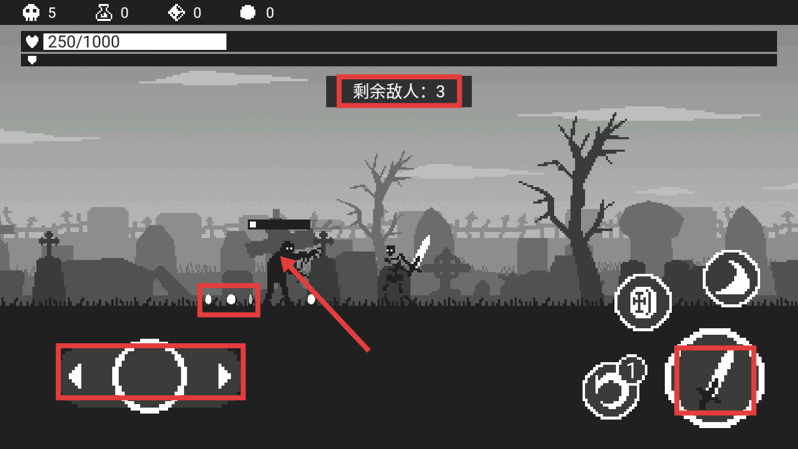 2、战斗时留意【剩余敌人-3】,操控移动与攻击键击败敌人,同时关注自身血量-250/1000状态。