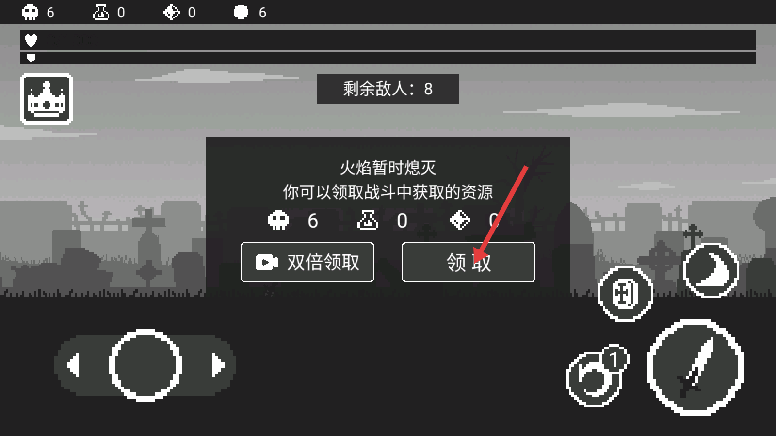 4、战斗结束后点击【领取】,获取战斗资源,积累骷髅头等道具,用于角色强化与道具解锁。