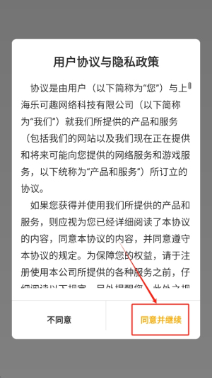 1、同意用户协议:在用户协议与隐私政策界面,点击“同意并继续”按钮以接受协议条款。