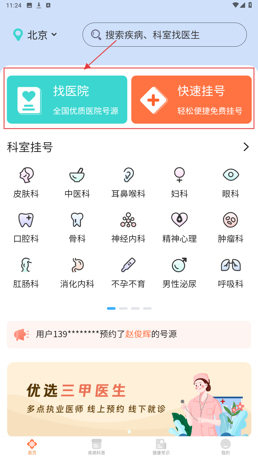 1、打开应用,在【首页】有找医院、快速挂号服务按钮,如点击【找医院】。