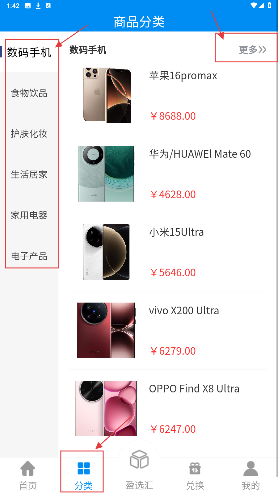 1、进入【分类】页,选左侧品类如【数码手机】,点【更多】看全品类商品。