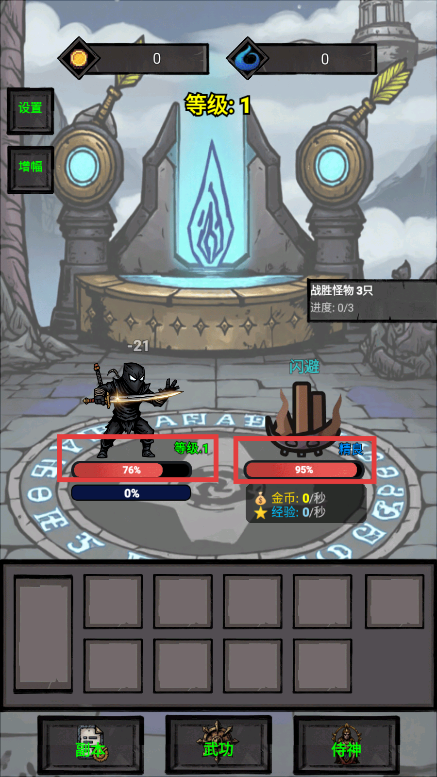 1、初始【等级-1】,留意【战胜怪物-3只-进度-0/3】任务,积累资源提升【等级】与【精良】进度,为战斗蓄力。