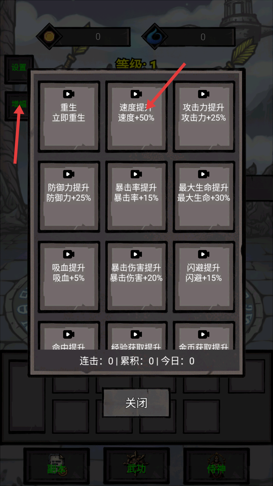 2、进入【增幅】界面,优先选择【速度提升-速度+50%】等增益,观看视频强化属性,快速提升战力。