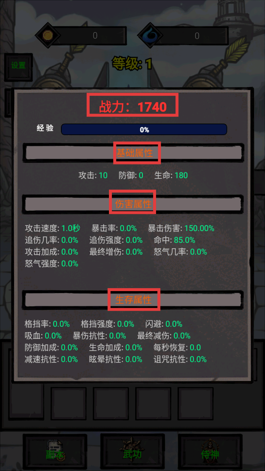 3、查看【战力-1740】与【基础属性】【伤害属性】【生存属性】面板,依据数据规划属性提升方向,针对性强化。