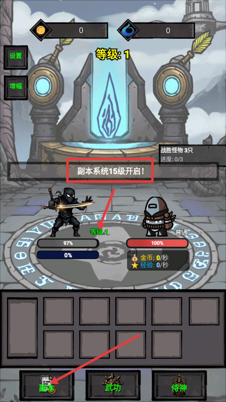 4、当前【等级-1】,需升级至15级解锁【副本系统】,同时关注【武功】【侍神】系统,为后期养成做准备。