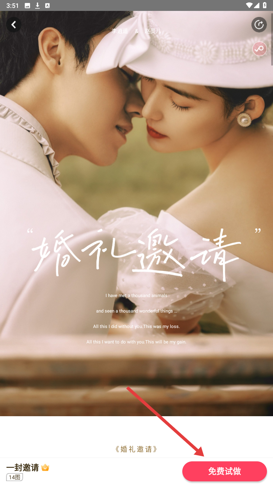 3、详情页点【免费试做】,开始定制婚礼请柬内容。