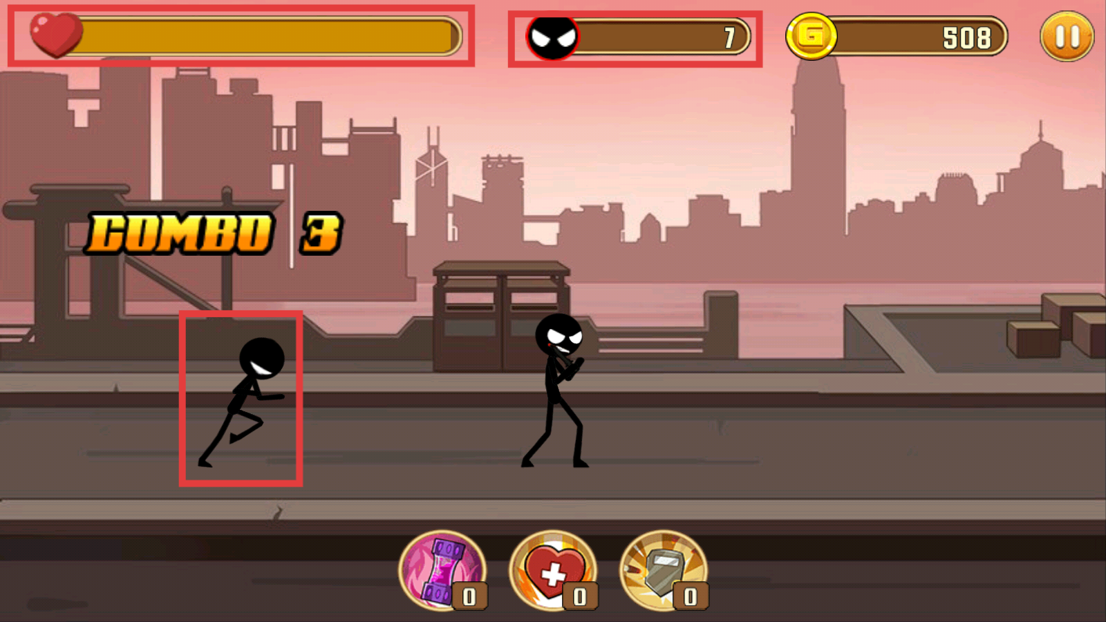 3、战斗时操控角色移动,连击数达【3】提升输出,留意顶部血量与敌人数量,合理规避伤害。