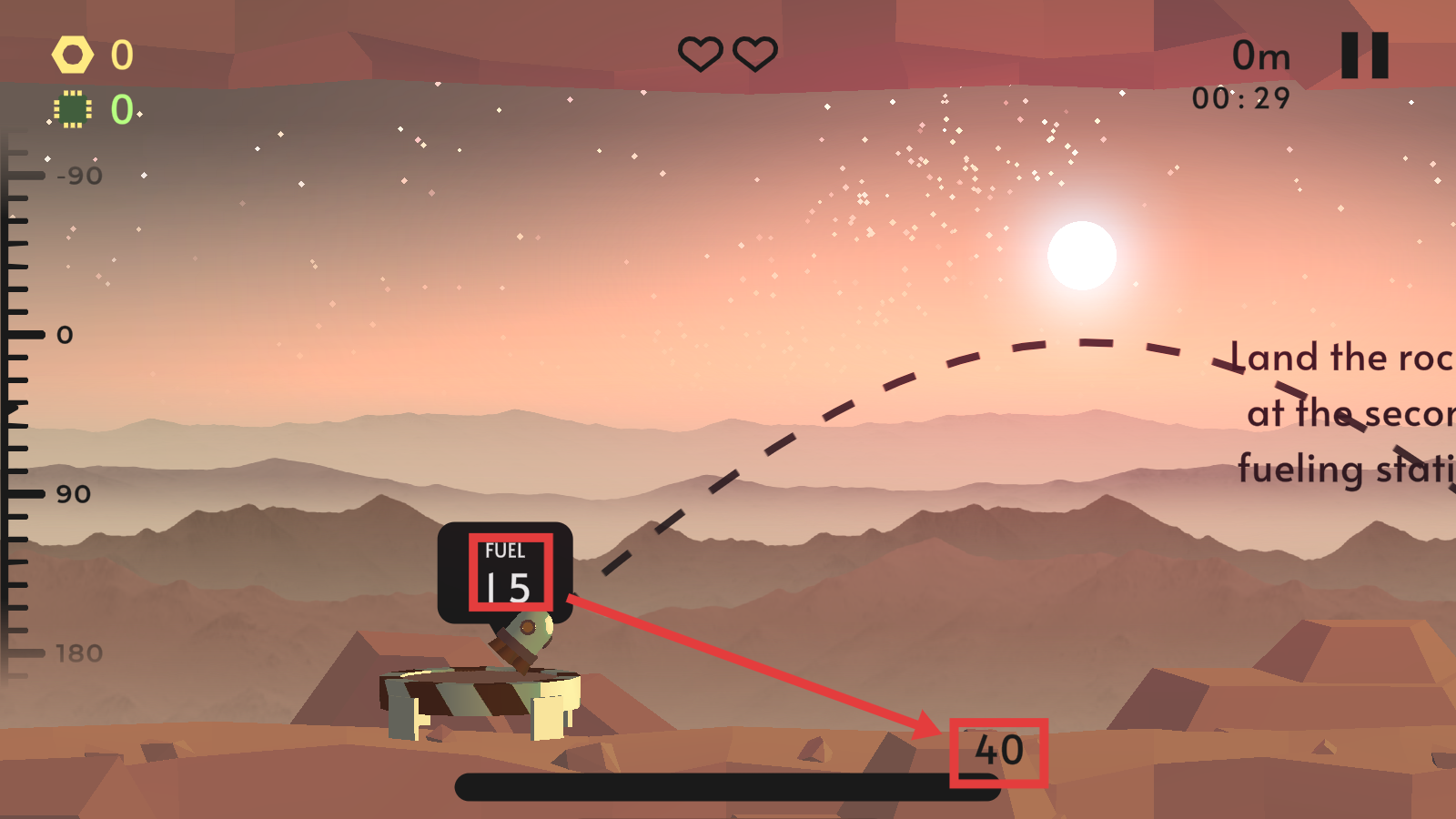 1、飞行时按【Scroll-to-rotate】调整角度,长按加速推进,朝着【Land-the-rocket-at-the-fueling-station】目标飞行,注意燃料状态。
