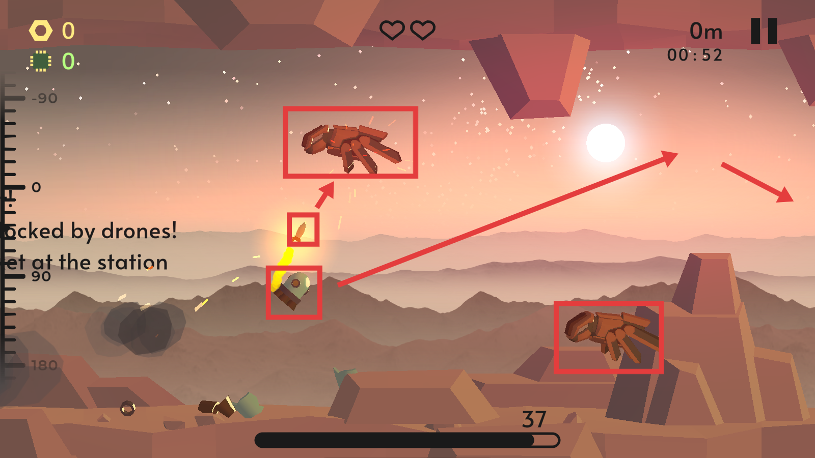 3、遭遇【Attacked-by-drones!】时,操控火箭灵活躲避敌人攻击,利用飞行技巧摆脱敌人,保障飞行安全。