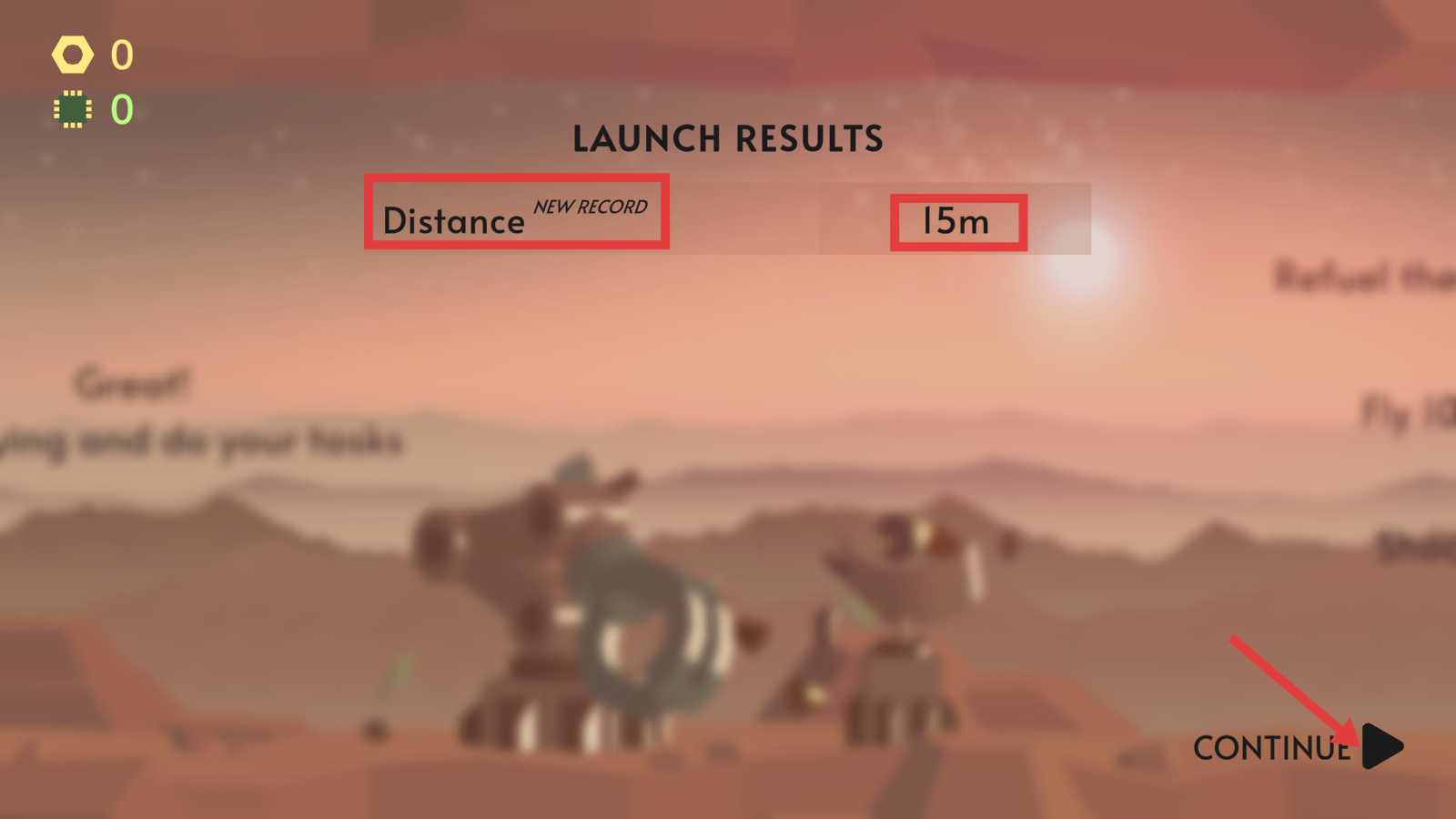4、查看【Distance-NEW-RECORD-15m】记录后,点击【CONTINUE】按钮,开启下一次飞行挑战,争取突破距离。