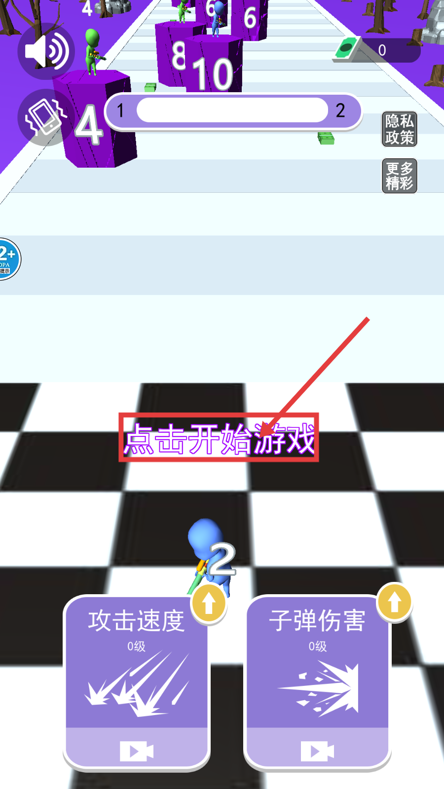 1、点击【点击开始游戏】进入关卡,可优先升级【攻击速度-0级】或【子弹伤害-0级】,提升初始战斗能力。
