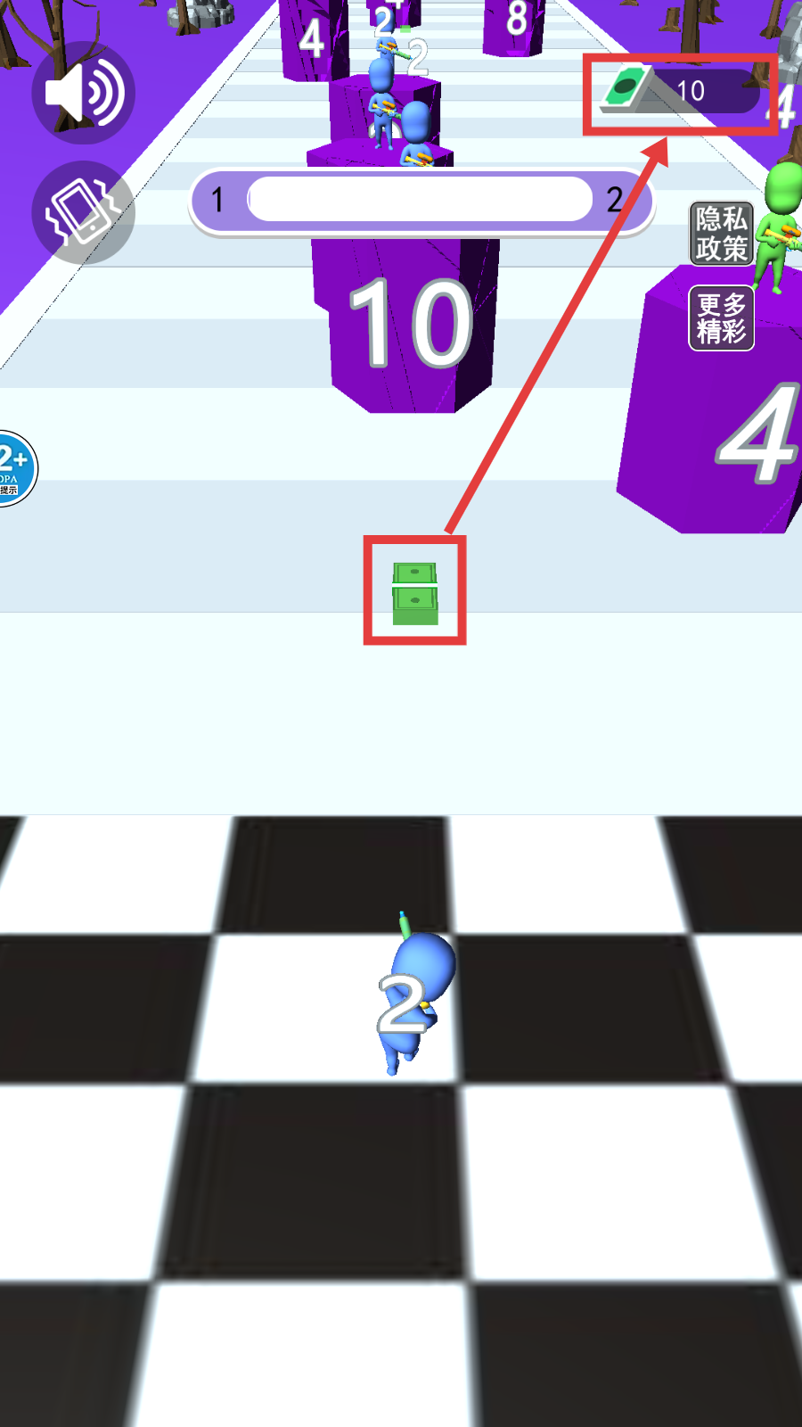 2、移动角色收集路上的绿色钞票,每次收集会使右上角钞票数增加,积累货币用于后续强化。