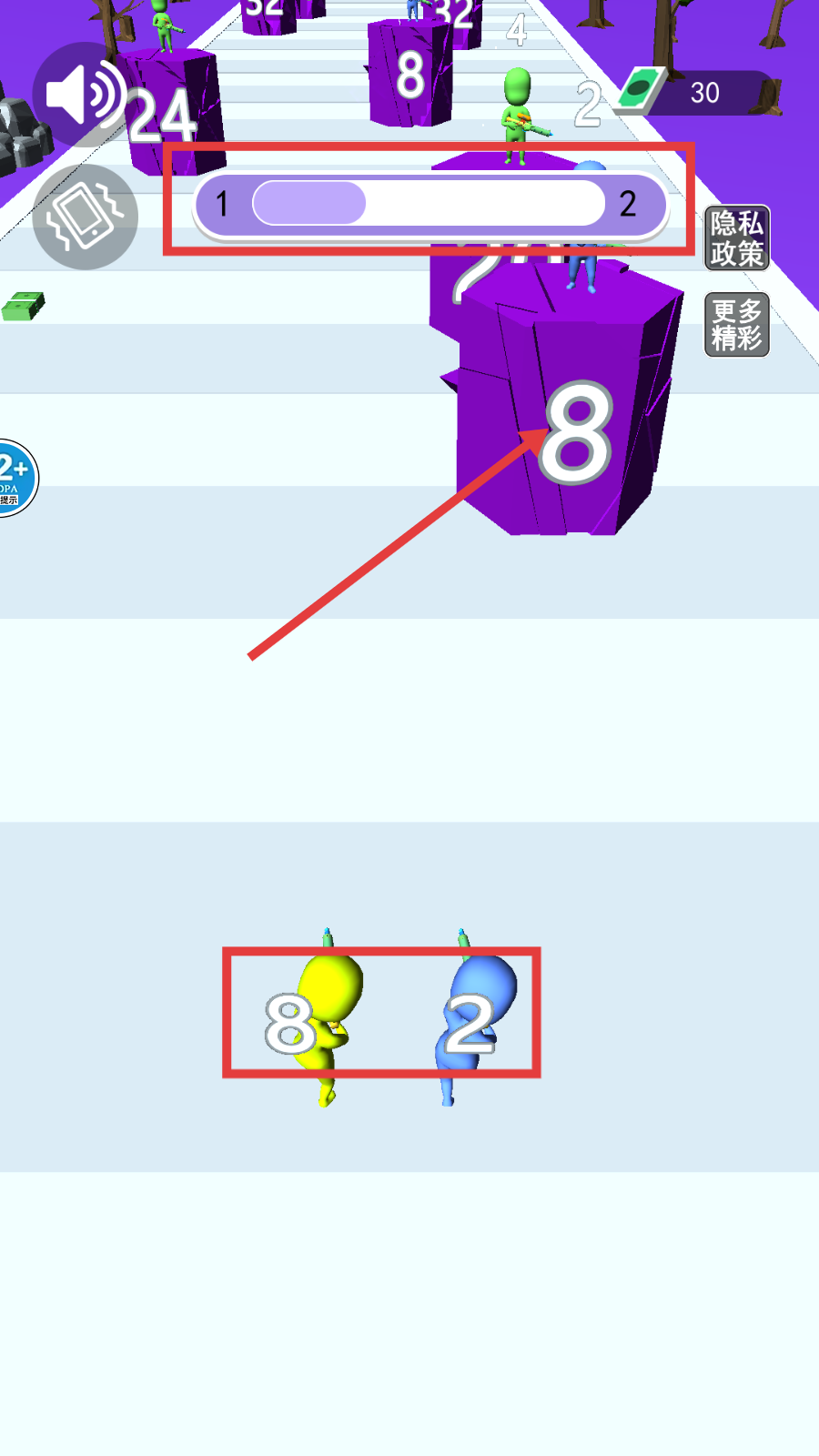 3、关注上方进度条推进,操控角色与其他数字小人合并,提升自身数字后攻击紫色方块,推进关卡进程。