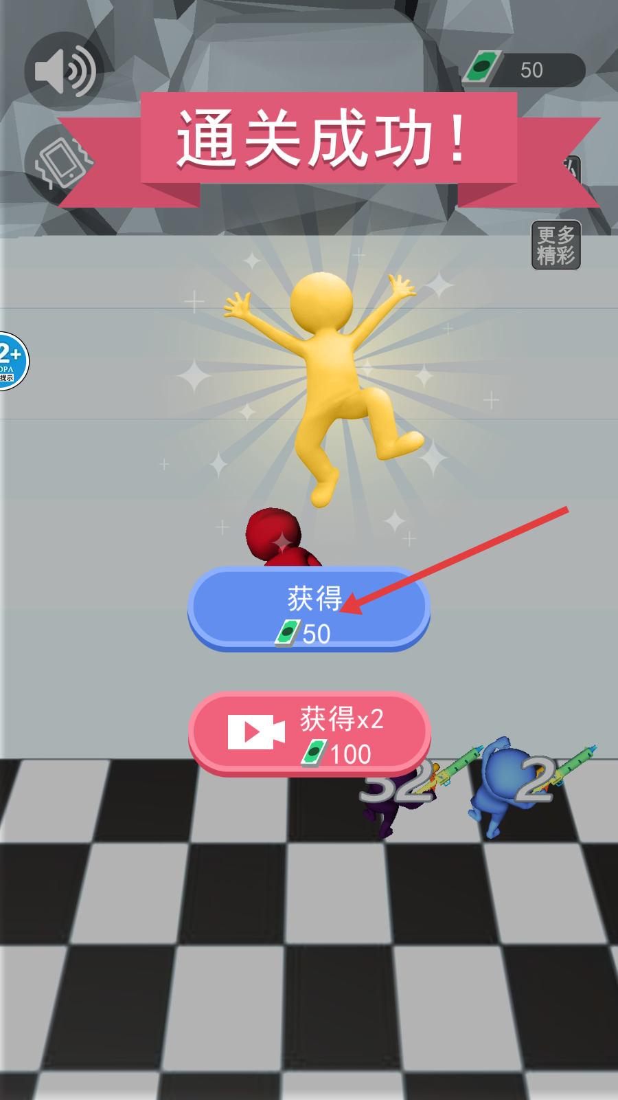 4、通关后点击【获得-50】领取奖励,若想快速积累可选择【获得x2-100】看视频翻倍获取钞票。