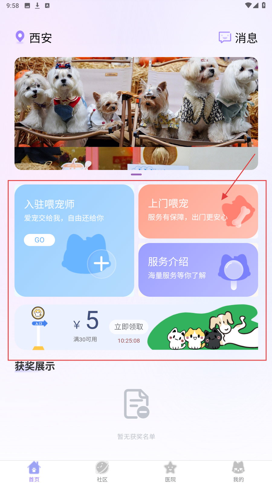 1、打开应用,在【首页】点击【上门喂宠】功能按钮。