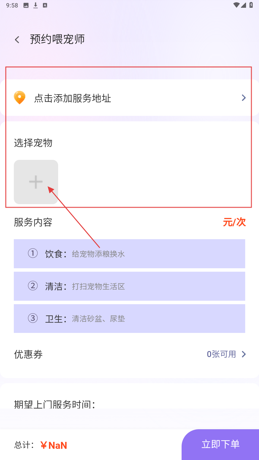 2、在【预约喂宠师】页面,添加服务地址,点击【+】选择宠物。