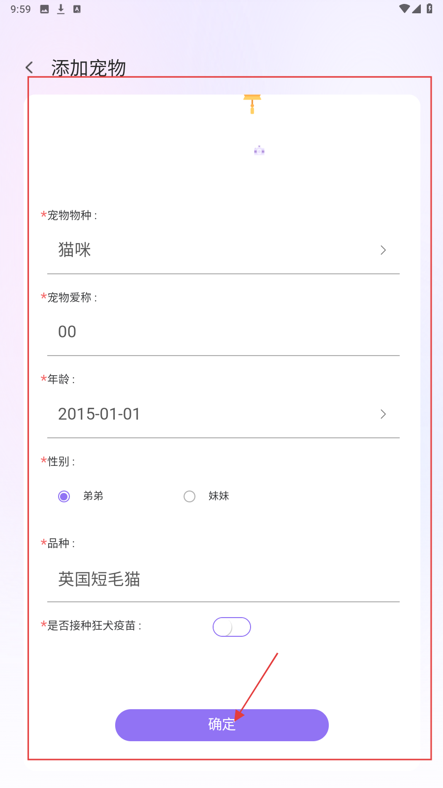3、在【添加宠物】页面,填写需要接受服务的宠物信息,填写完成点击【确定】。