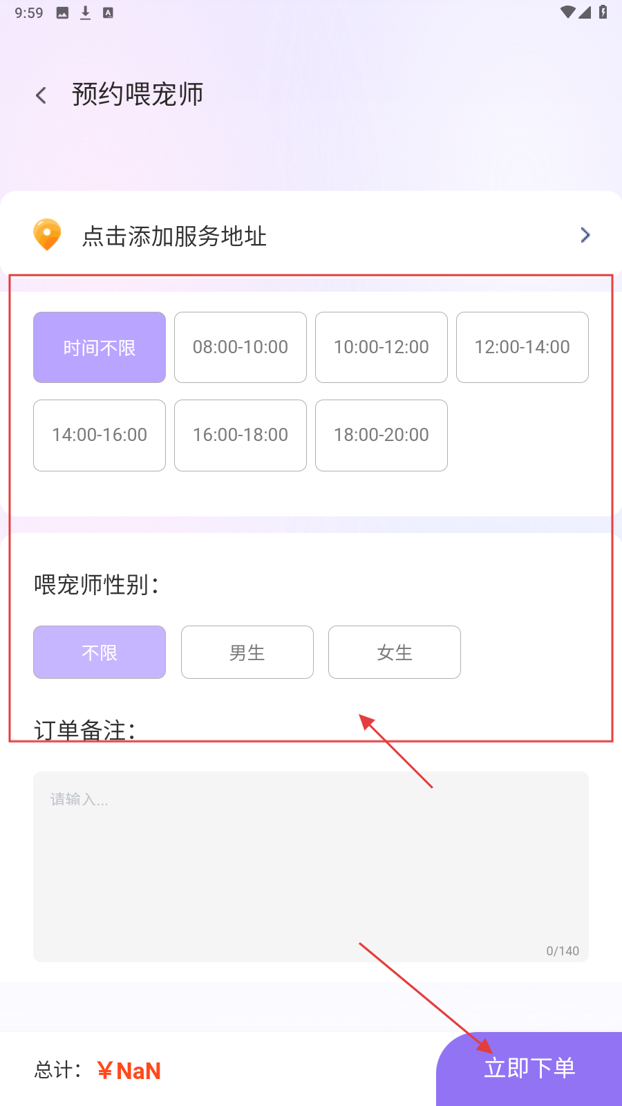 4、添加完成后选择上门时间、喂宠师性别等,全部选择完成点击【立即下单】即可。