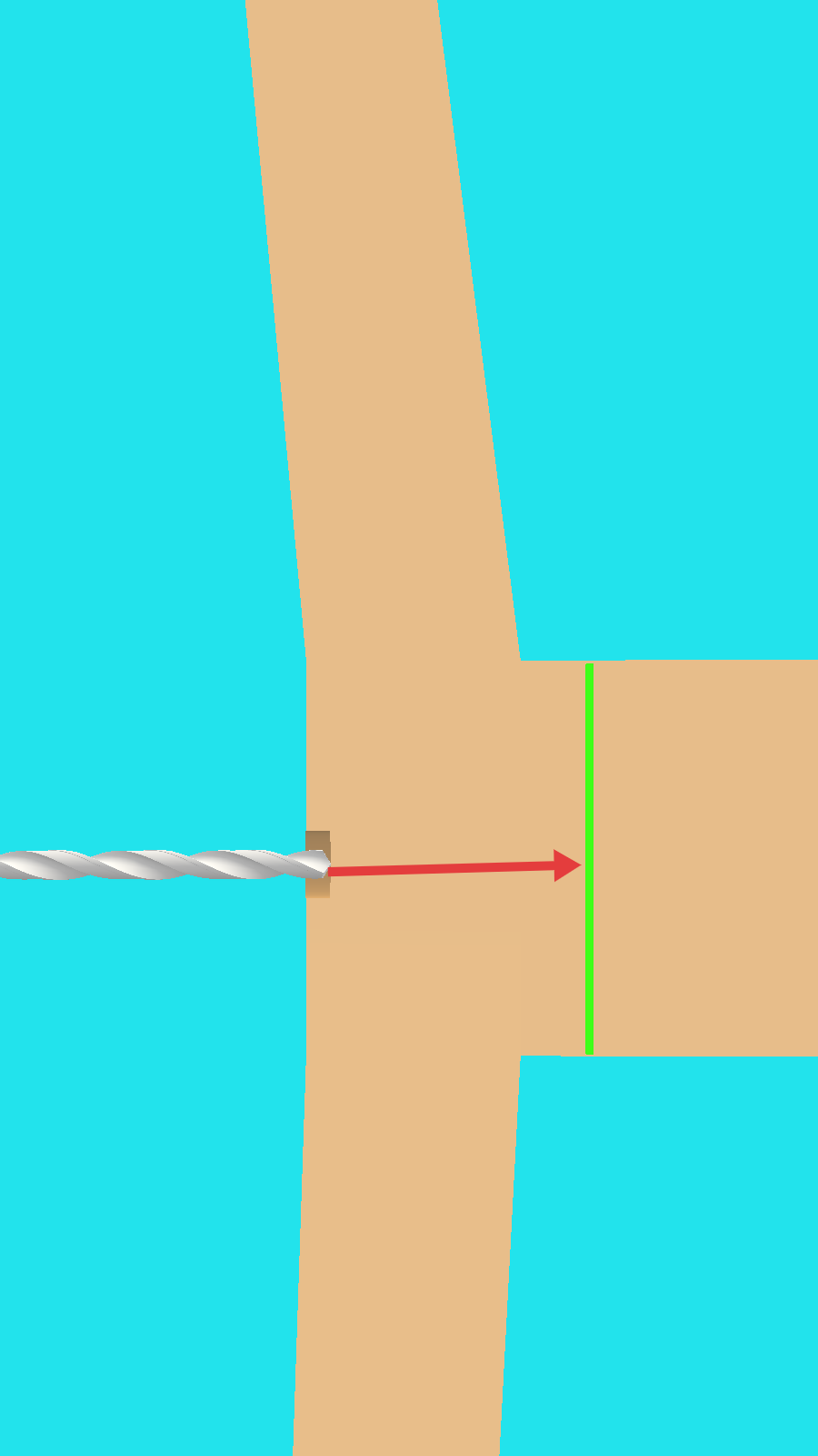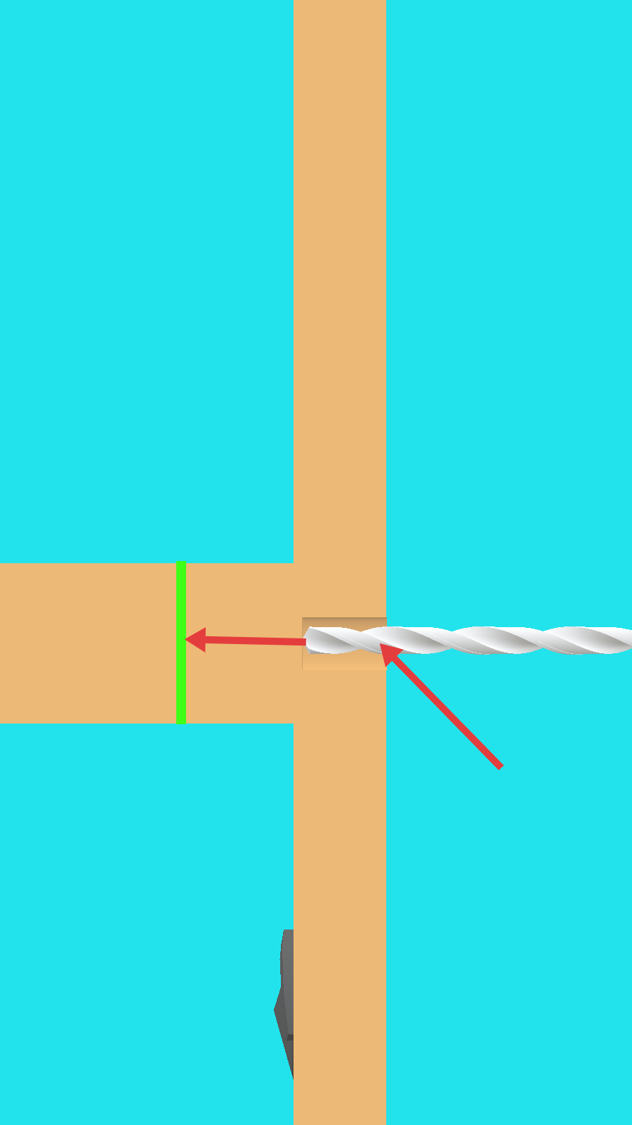 1、控制【钻头】沿红色箭头方向推进,对准左侧【绿色竖线】区域,精准钻孔开启路径。