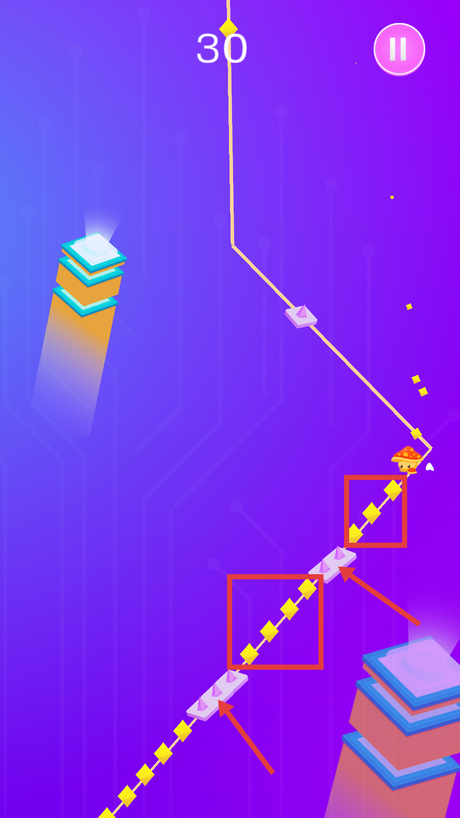 3、操控角色沿轨道前进,收集【黄色方块】积累分数,遇【尖刺平台】及时跳跃,保持移动节奏。