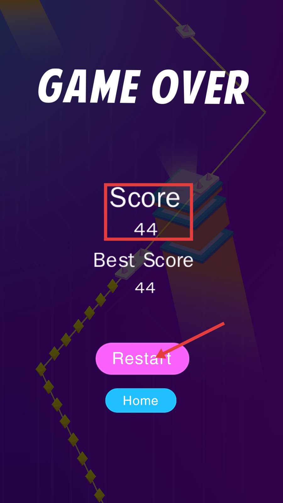 4、游戏结束后查看【Score-44】,点击【Restart】按钮重新挑战,尝试突破最高分数记录。