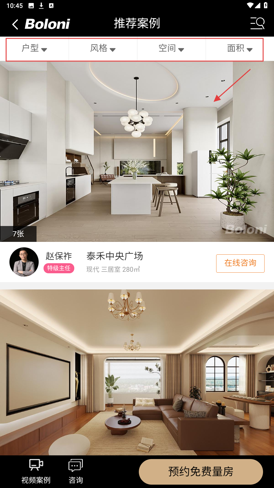 2、在【推荐案例】页面,可以在上方用户型、风格等筛选,选择心仪的案例并点击进入。