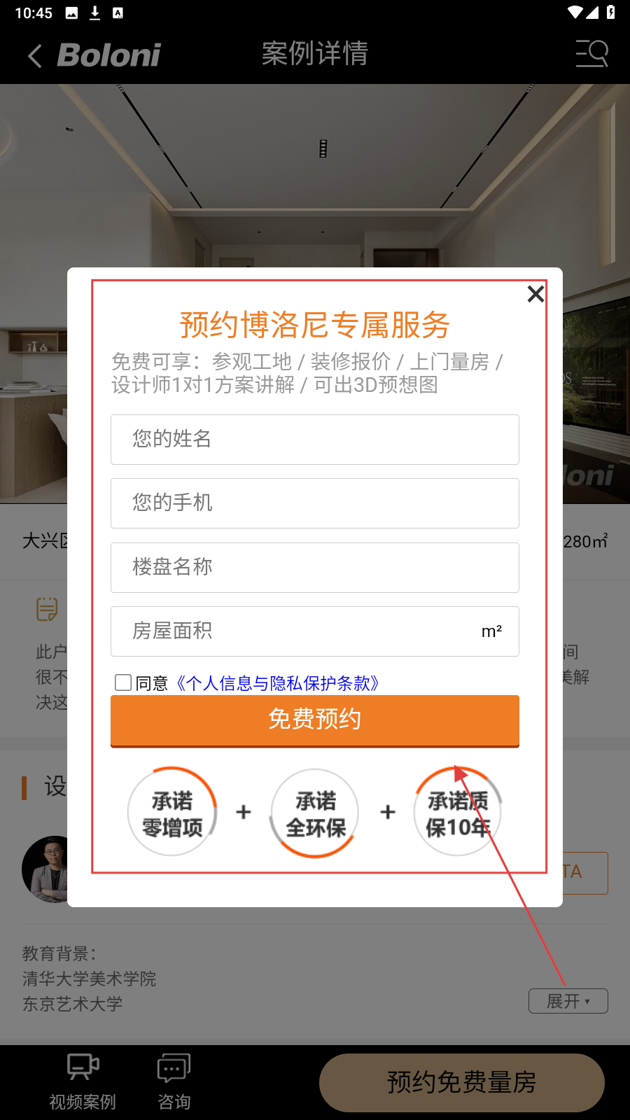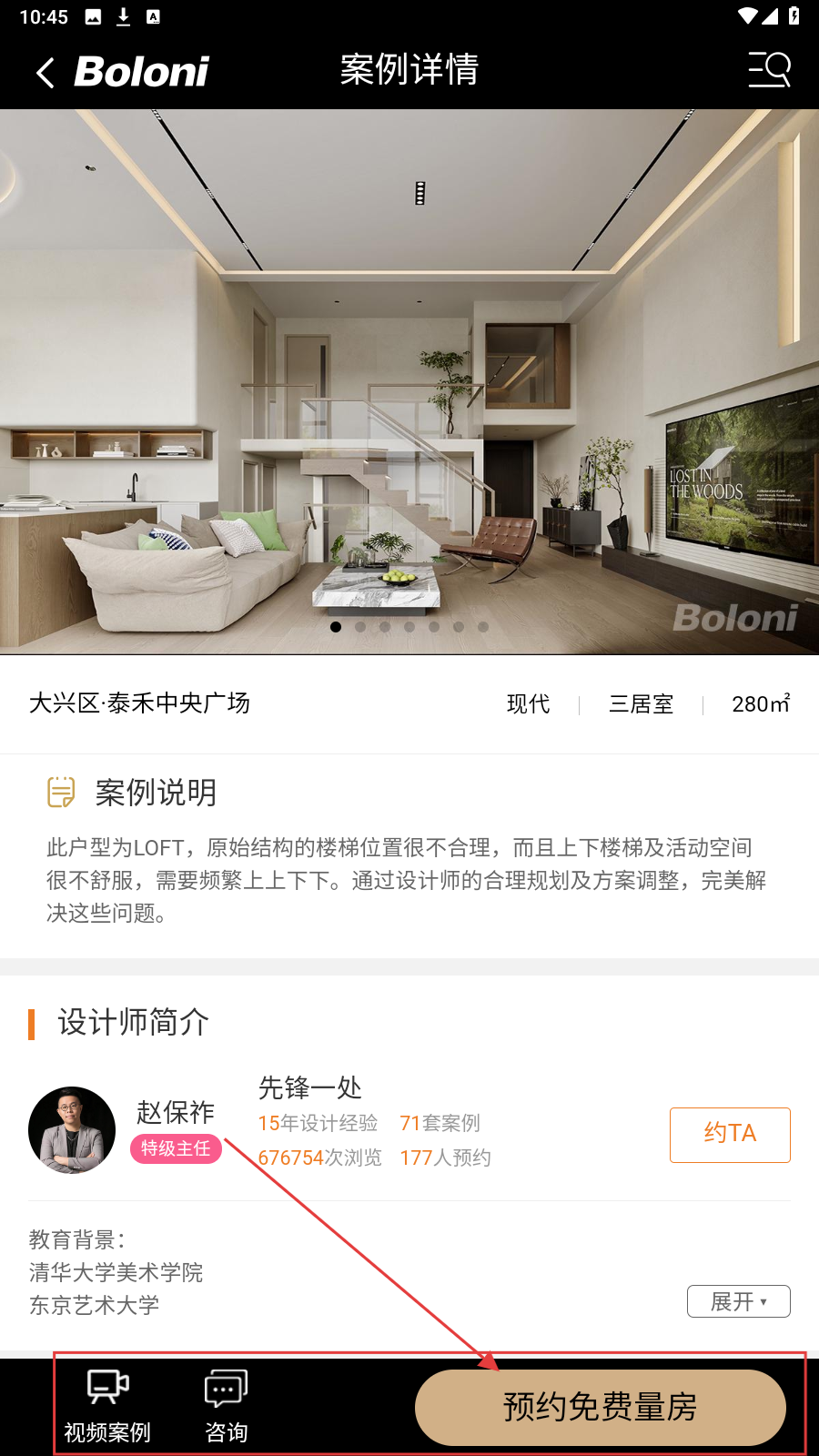 3、在【案例详情】页面,查看案例信息,还可以点击下方【预约免费量房】。