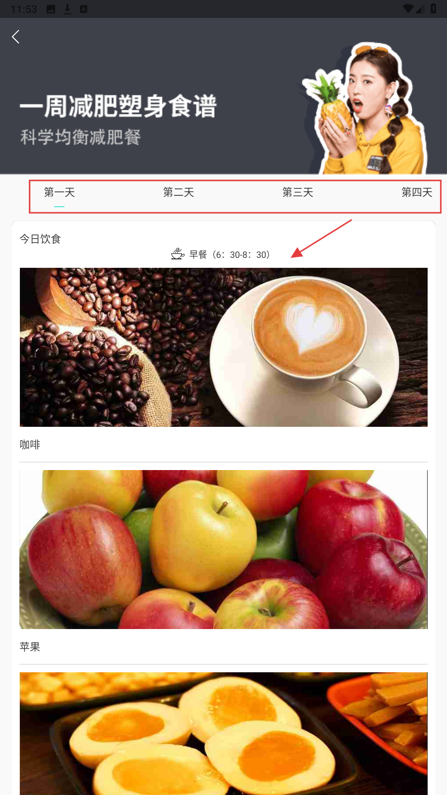 2、进入食谱页,可切换【第一天】至【第四天】,查看对应时段早餐等饮食安排。