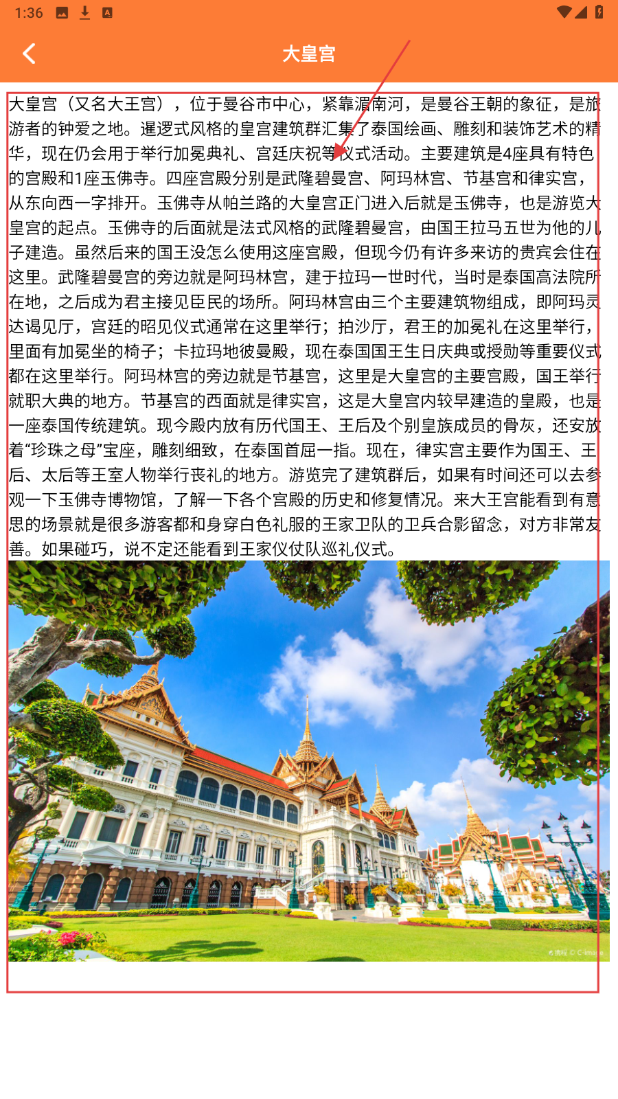 2、点景点卡片(如大皇宫),浏览建筑特色、游览路线等攻略信息。