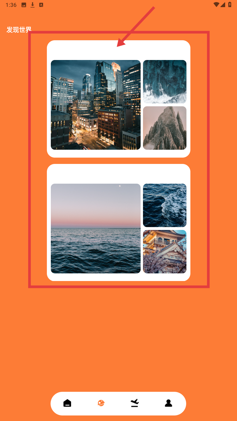 3、到【发现世界】,选城市夜景、自然风光等主题图组,探索旅行灵感。