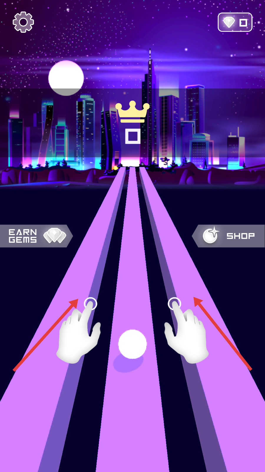 1、开始时点击左右区域控制球体移动,留意【EARN-GEMS】与【SHOP】按钮位置,熟悉基础操作再推进。