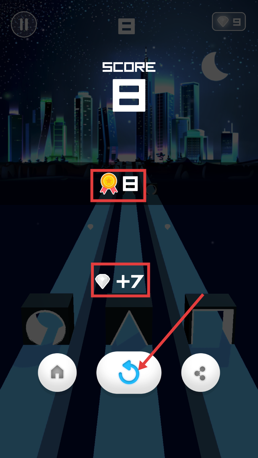 4、关卡结束后查看【SCORE】与【钻石-+7】收益,点击重新挑战按钮可再次尝试提升成绩。