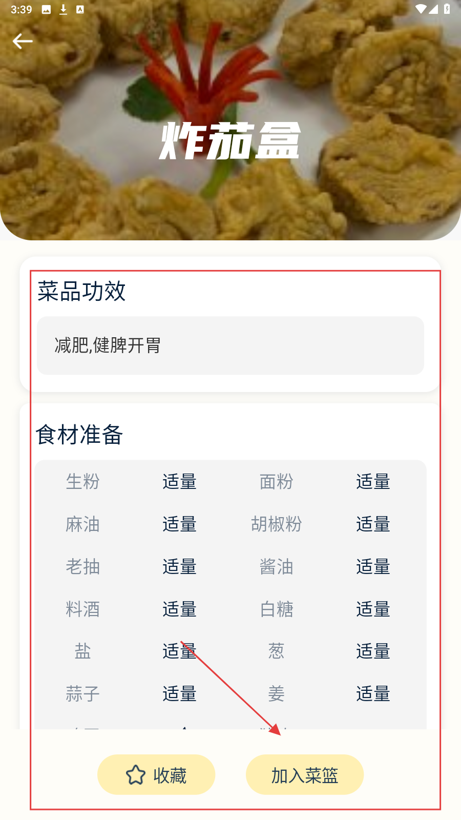 3、查看【炸茄盒】详情后,若想备菜,点击【加入菜篮】,方便后续采购食材。