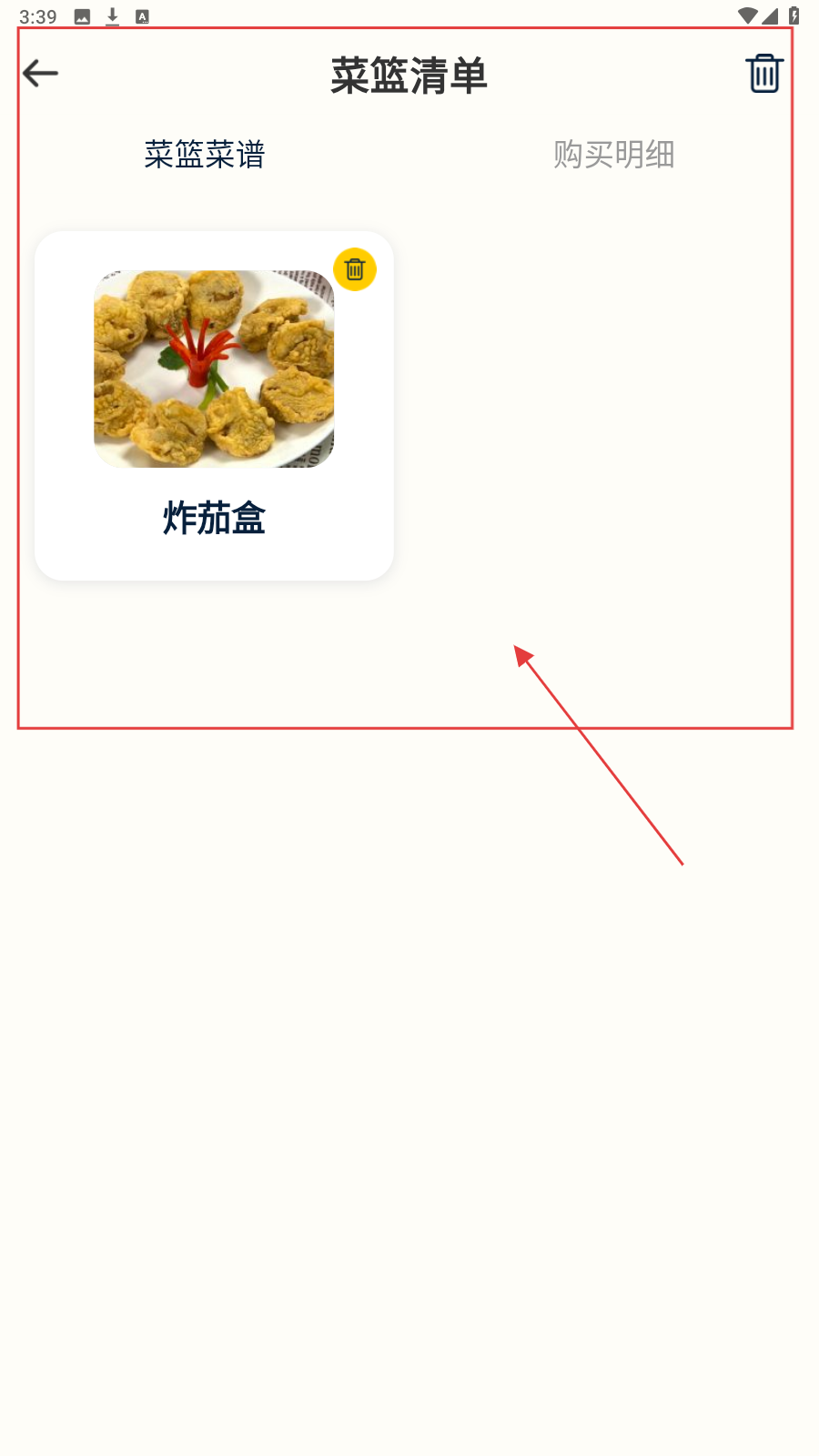 4、进入【菜篮清单】,可查看已加入的菜品,如【炸茄盒】,管理待购食材。