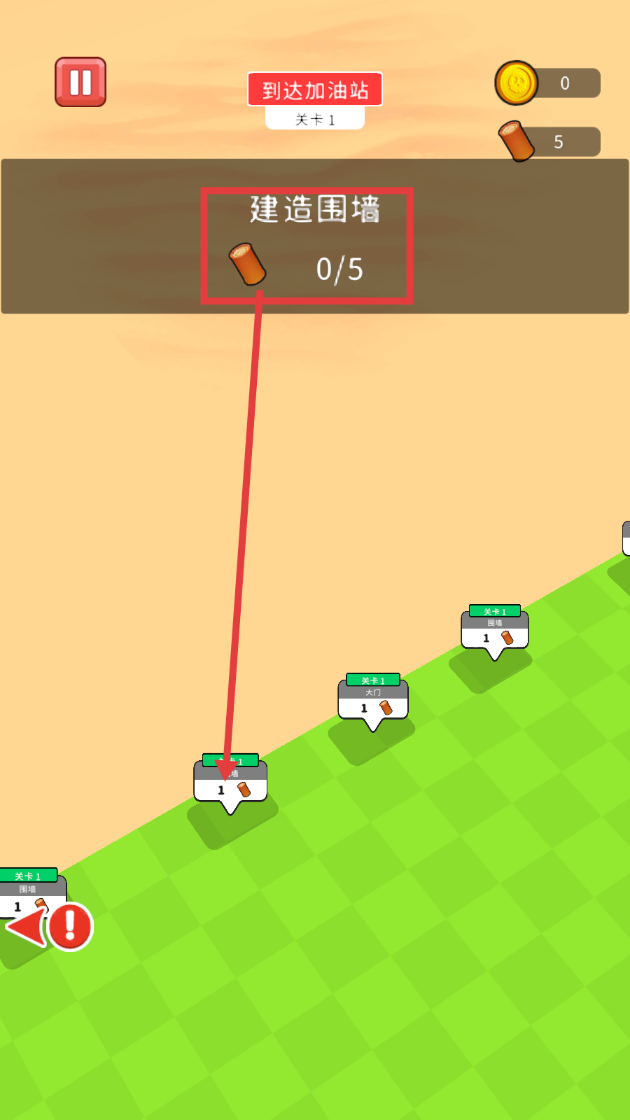 2、木材收集够后,依据【建造围墙-0/5】的任务提示,把木材运送至对应建筑位置去建造。