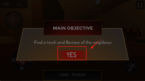 4、接受任务:在倒计时“TIME:120”界面,阅读任务提示“FIND TORCH”后点击“YES”即可正式开局。