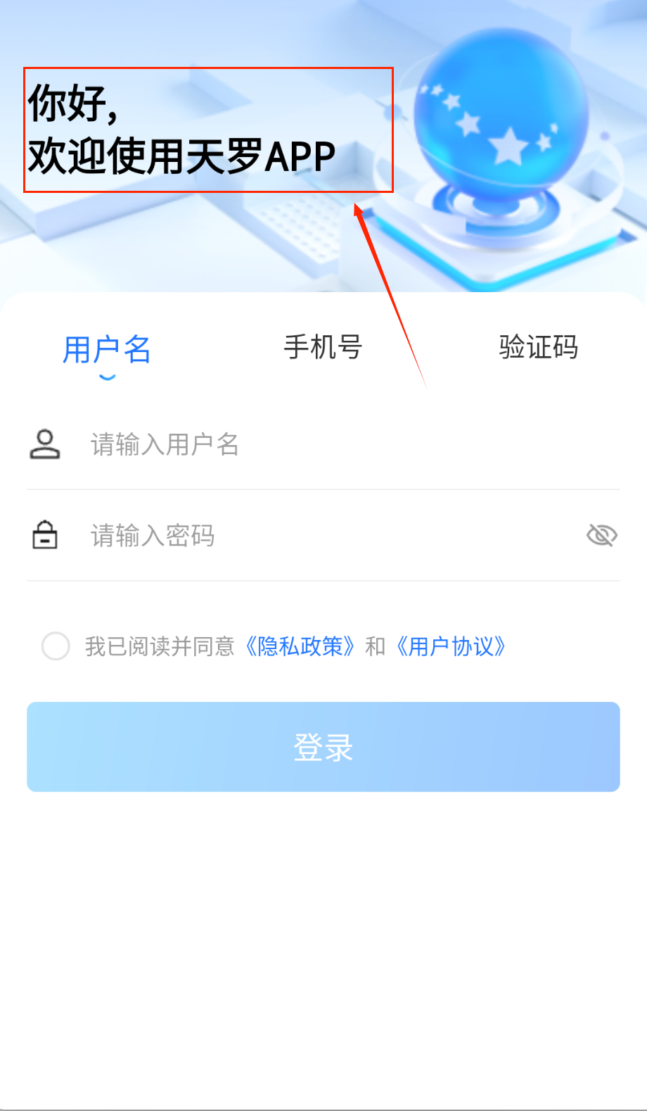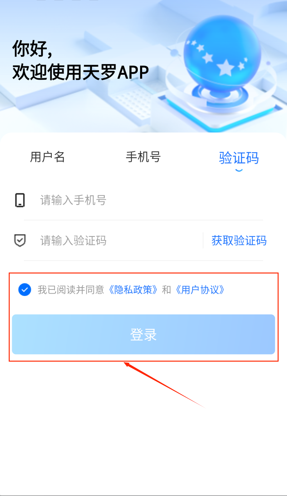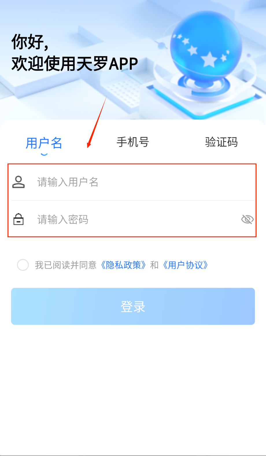 4、 勾选底部“同意用户协议和隐私政策”复选框(默认未勾选),点击蓝色“登录”按钮提交。若未勾选协议,按钮呈灰色不可点击状态。