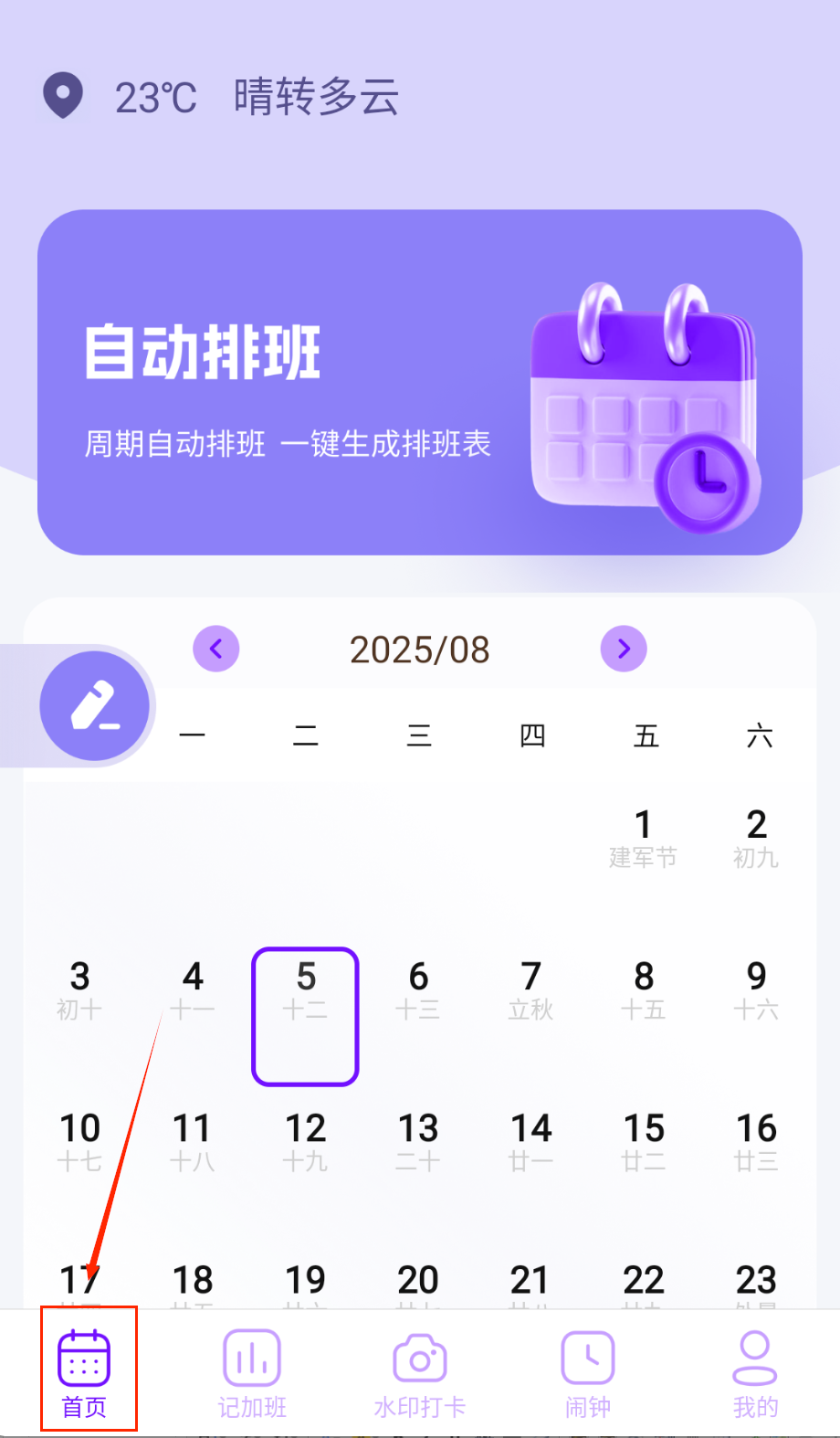 2、日历按周/月展示排班表,不同班次用颜色区分,点击日期查看详细工作时间,支持导出PDF格式,休息日自动标红提示哦。