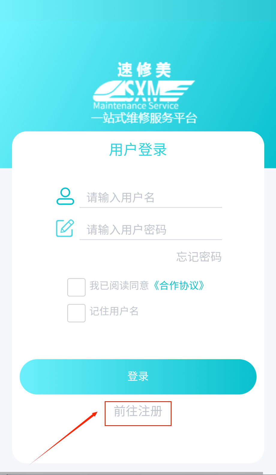 1、打开APP进入登录页,顶部显示时间状态,中间是"速修美 一站式维修服务平台"标识呀。点击"新用户注册"进入注册流程哦。