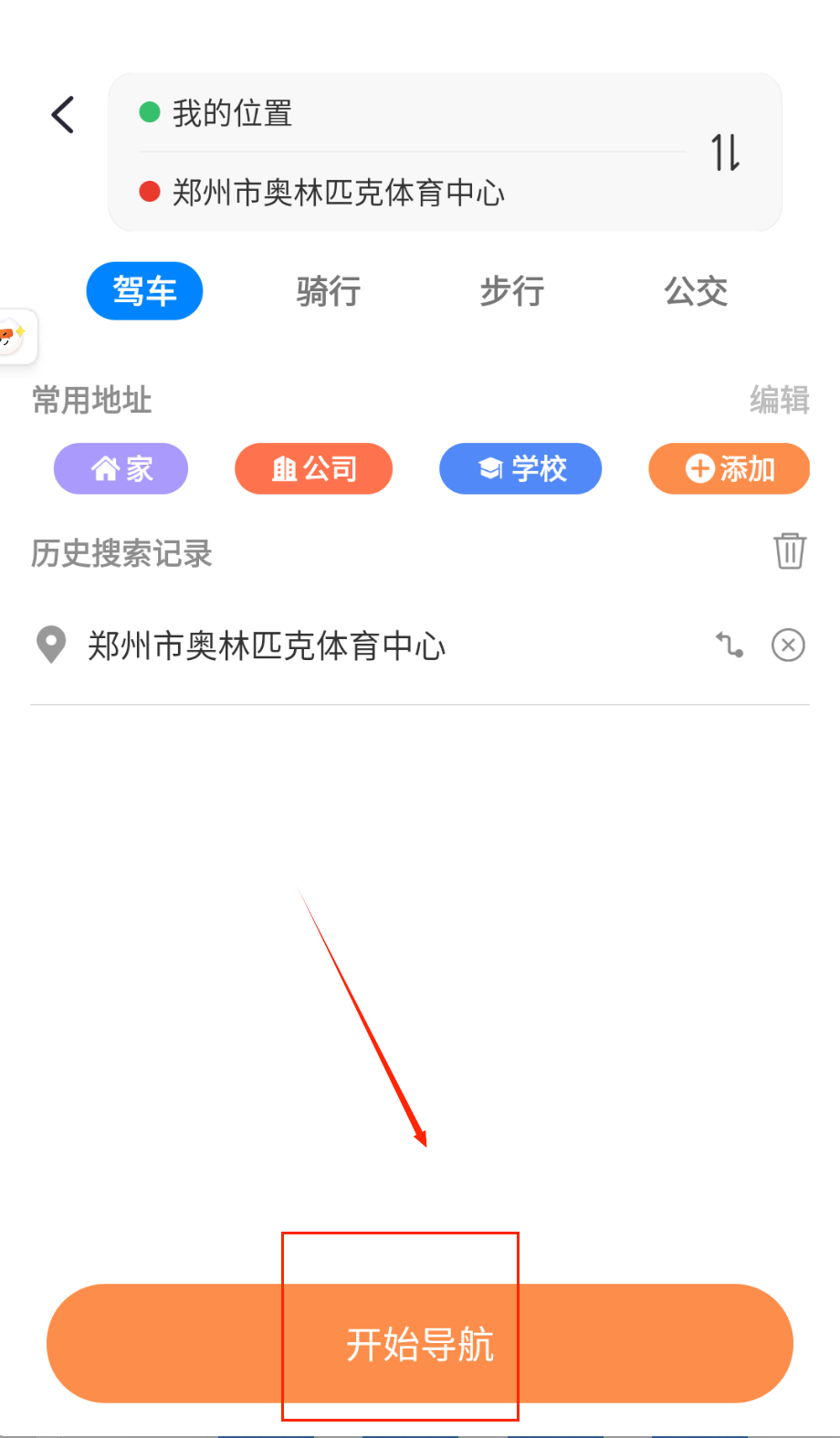2、 选择出行模式(驾车/公交/骑行/步行),查看系统推荐的三种路线方案,对比时间距离与红绿灯数量后点击开始导航。