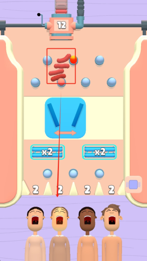 2、点击投放香肠:通过点击屏幕控制机器投放香肠,把握投放时机,让香肠顺利下落,尝试送进下方人物嘴里,完成基础操作。