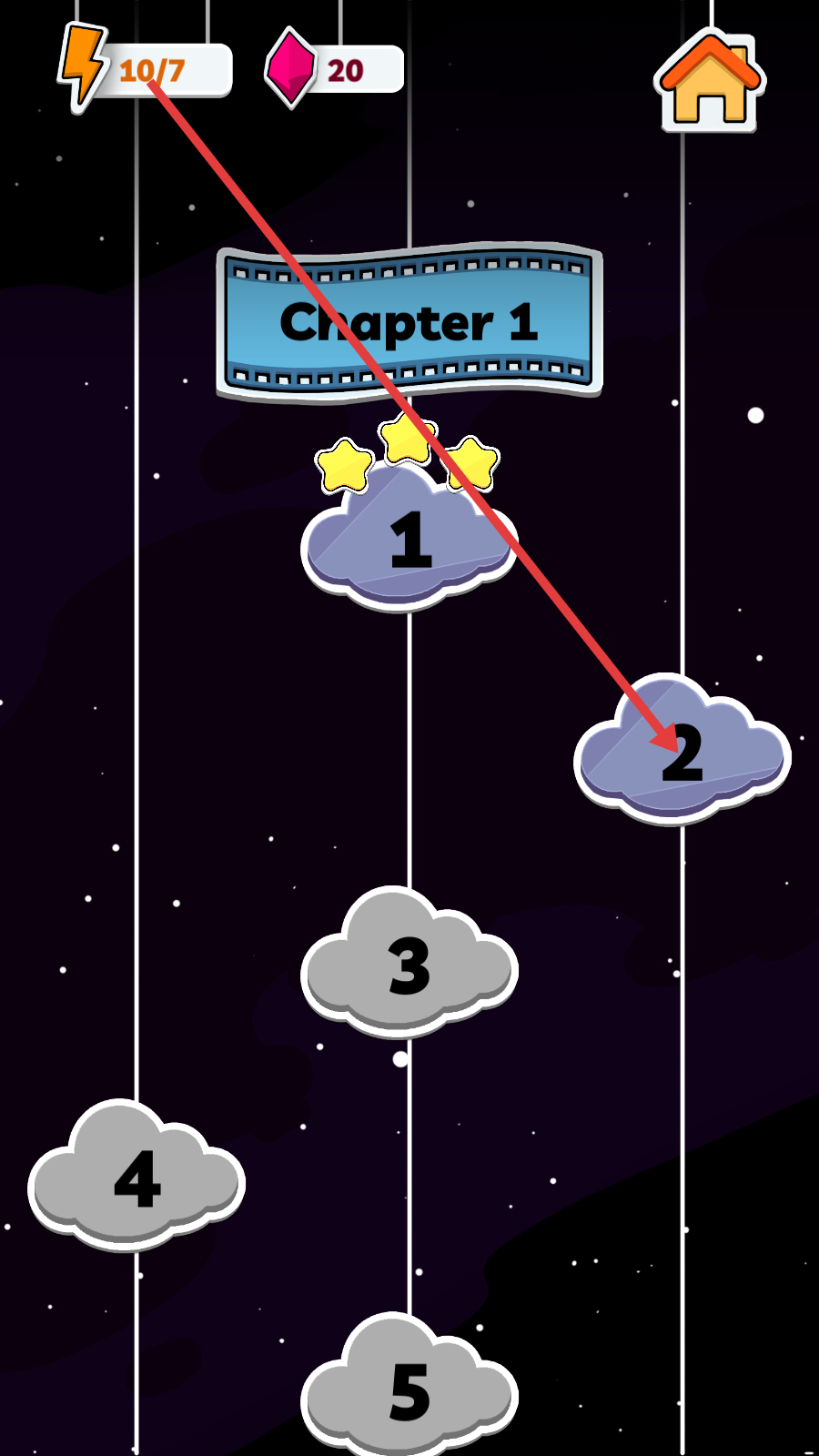 1、完成【Chapter-1】的第1关后,点击标有【2】的云朵图标,即可进入【Stage-2】开始新挑战。