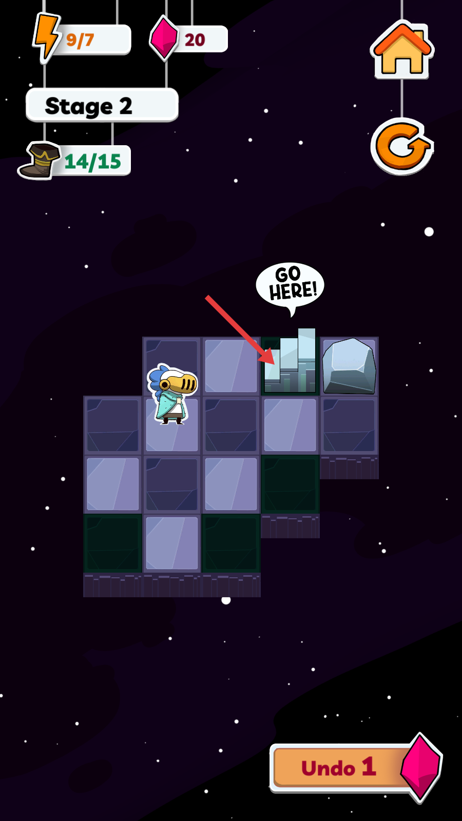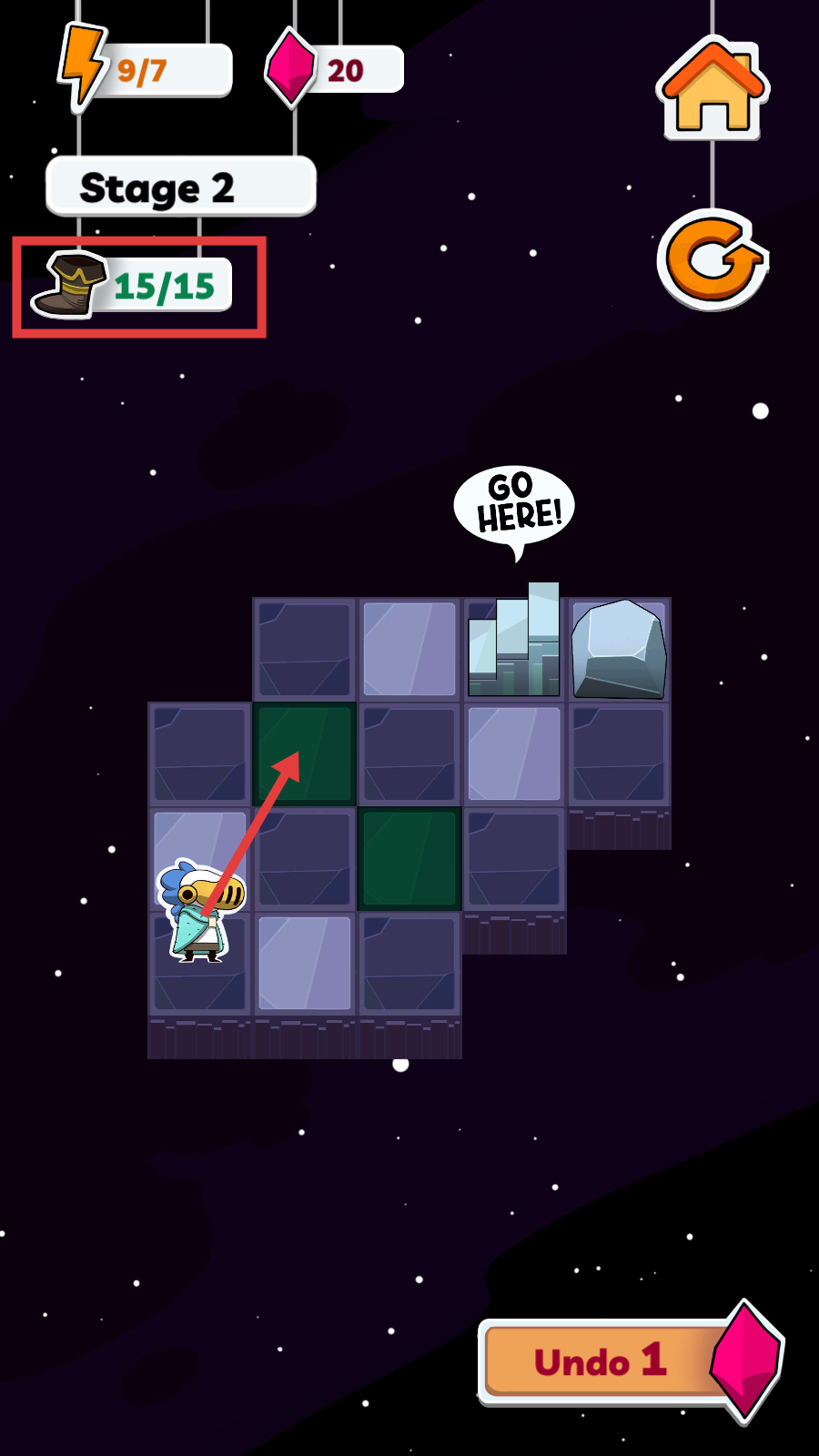 2、在【Stage-2】中,跟随红色箭头指引移动角色至绿色方格,同时注意合理使用【靴子-15/15】的行动值。