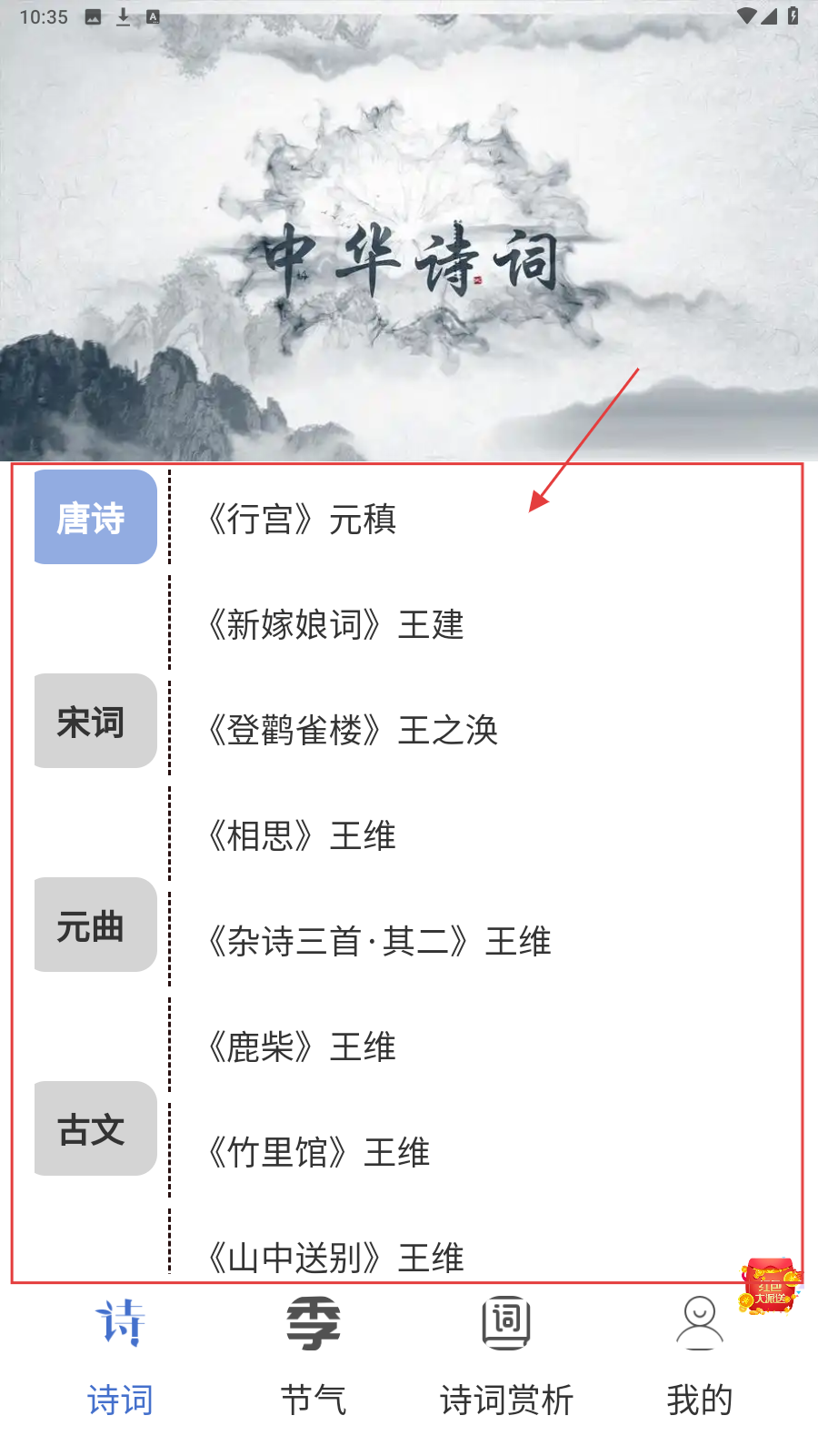 1、打开应用,在【诗词】页面,按照朝代选择要学习的诗词,如点击【行宫】。