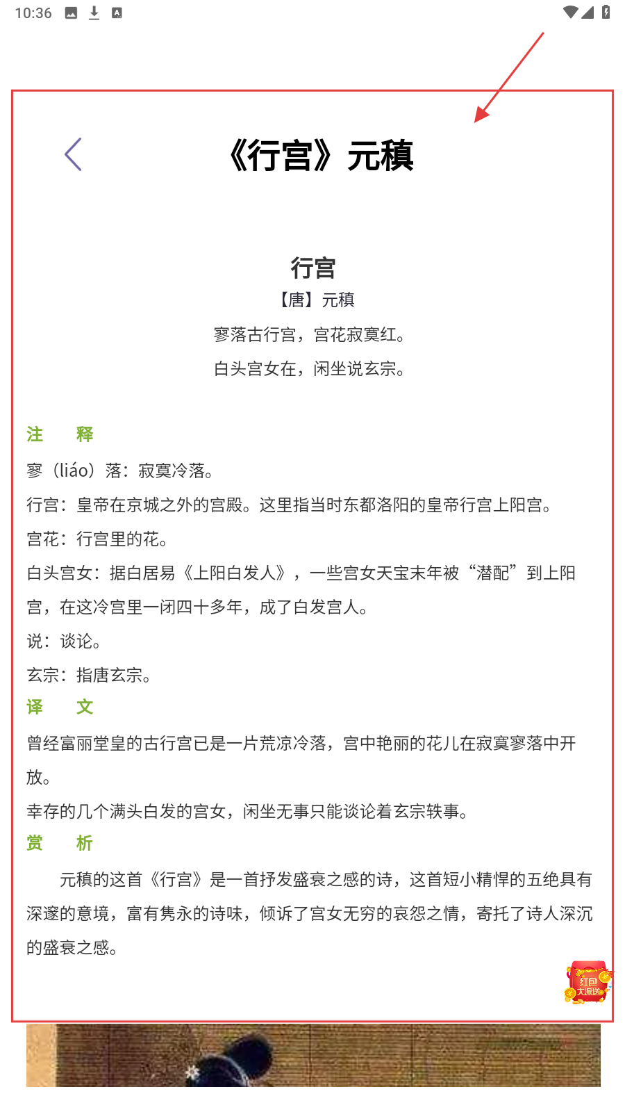 2、进入古诗阅读页,查看古诗内容、注释等,深度了解古诗内涵。