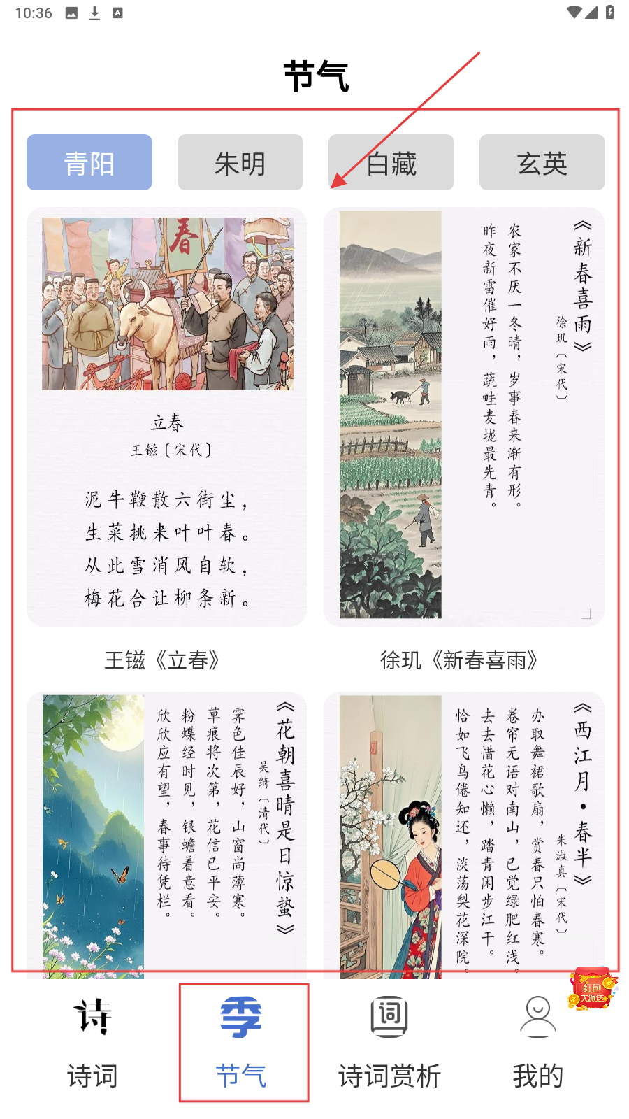 3、点击【节气】,可以按照青阳、朱明等分类查看古诗。