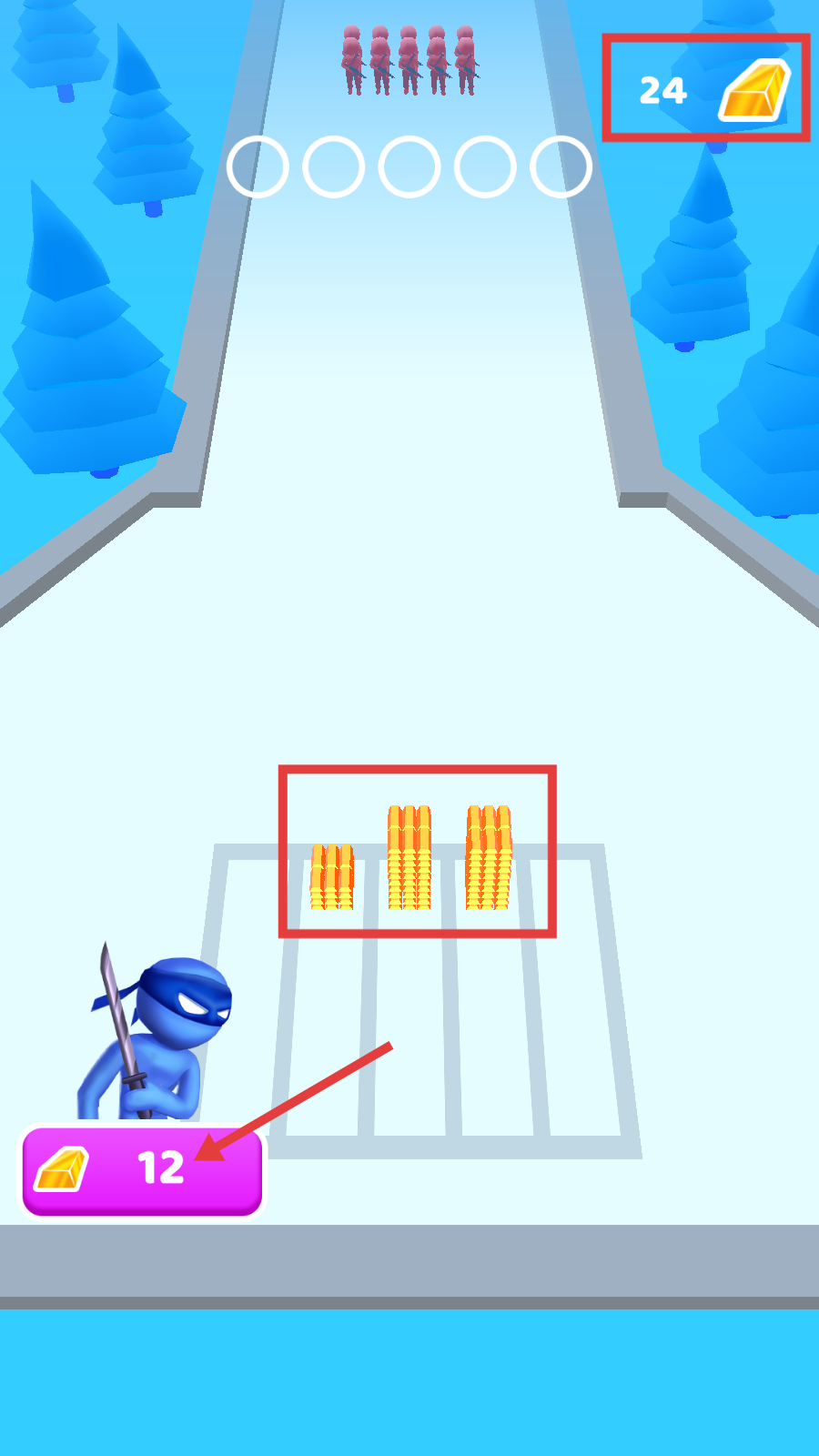 1、开局先收集路径上的金条堆,使【紫色框-12】的金币数增加,同时留意【右上角-24】的目标数值,为后续对战攒资源。