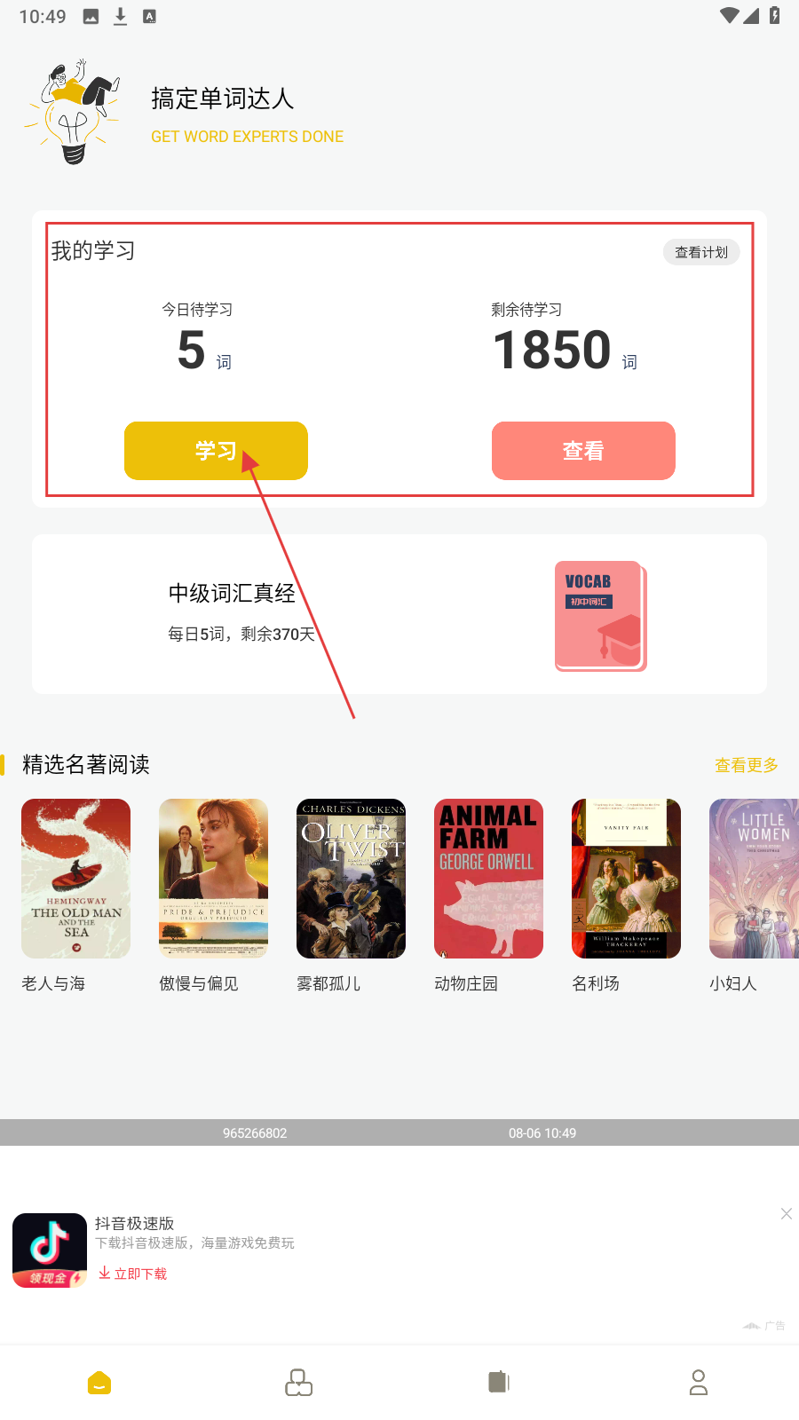 1、打开应用,在主界面点击【学习】开启今日背单词任务,积累词汇。