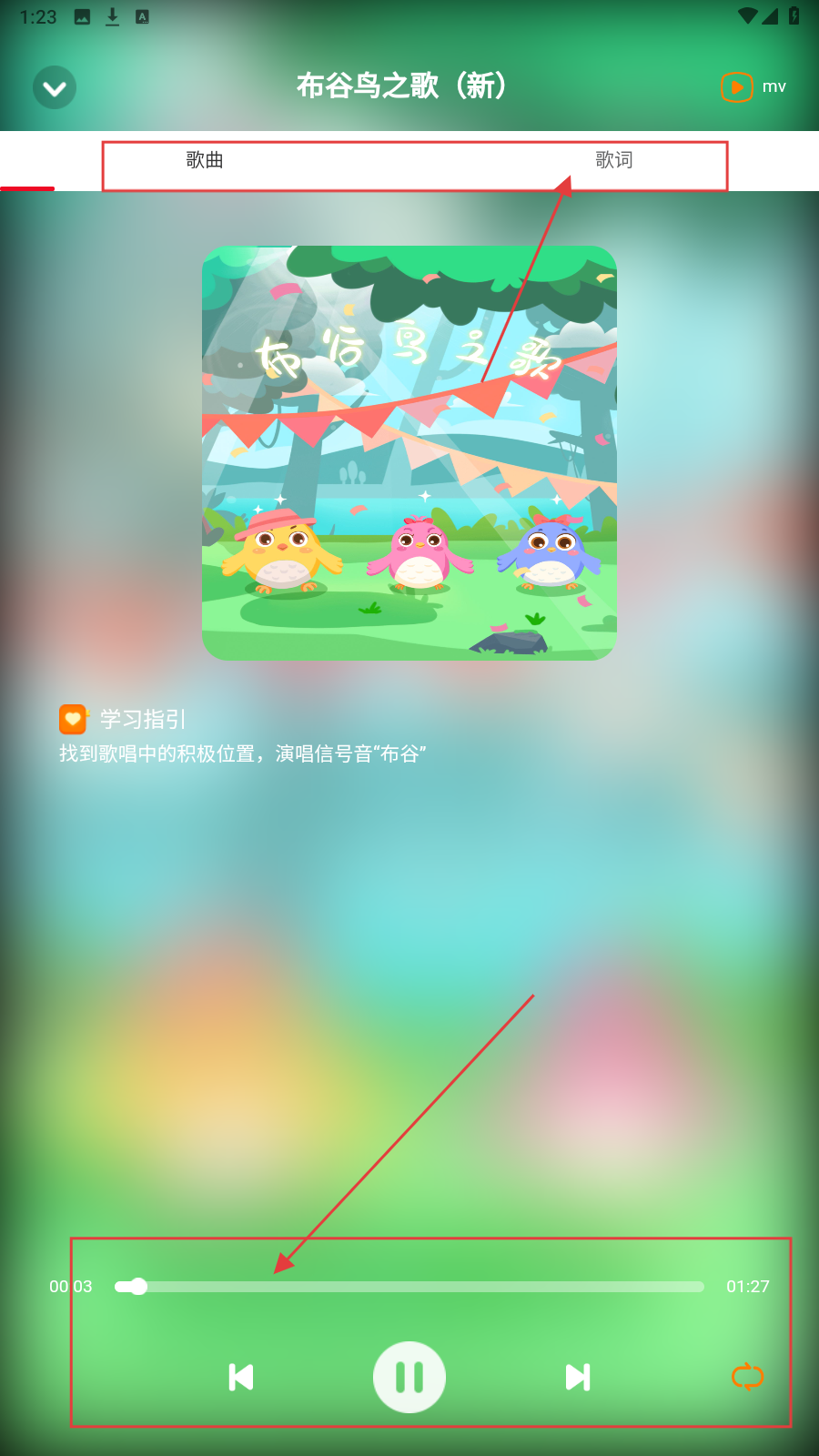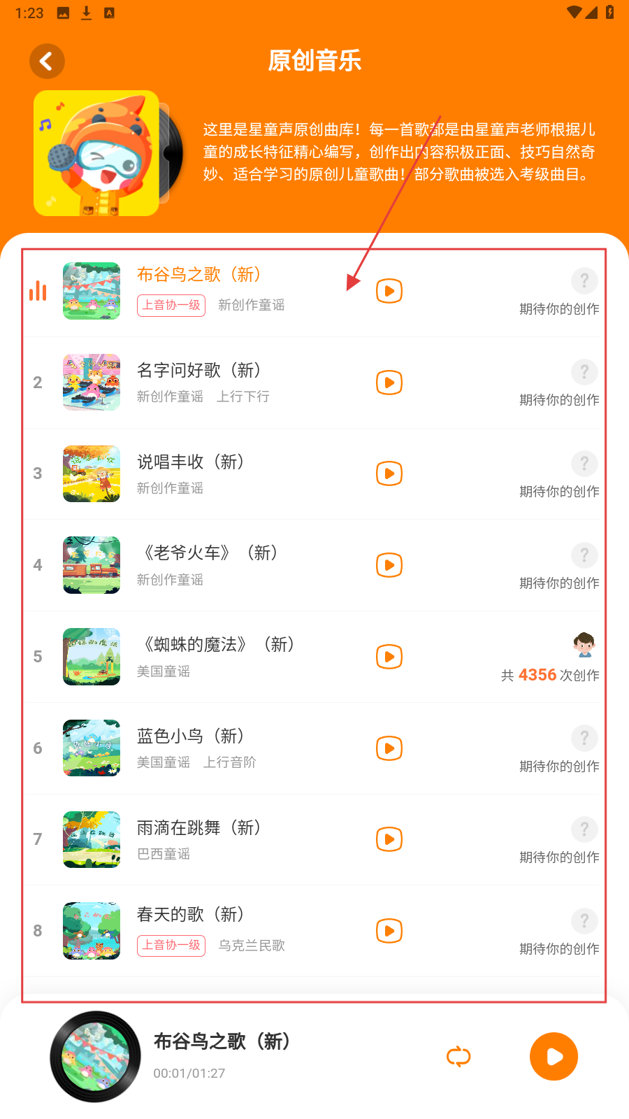 2、在原创音乐页,选《布谷鸟之歌(新)》,点播放按钮听歌。
