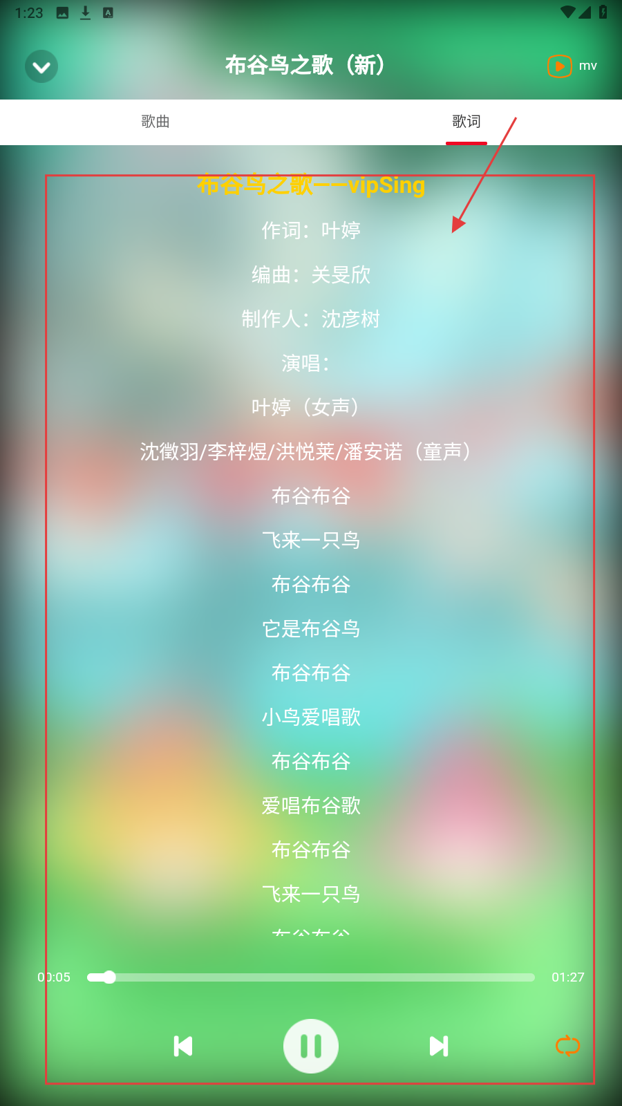 4、在歌词页,查看《布谷鸟之歌(新)》作词、编曲等创作信息。